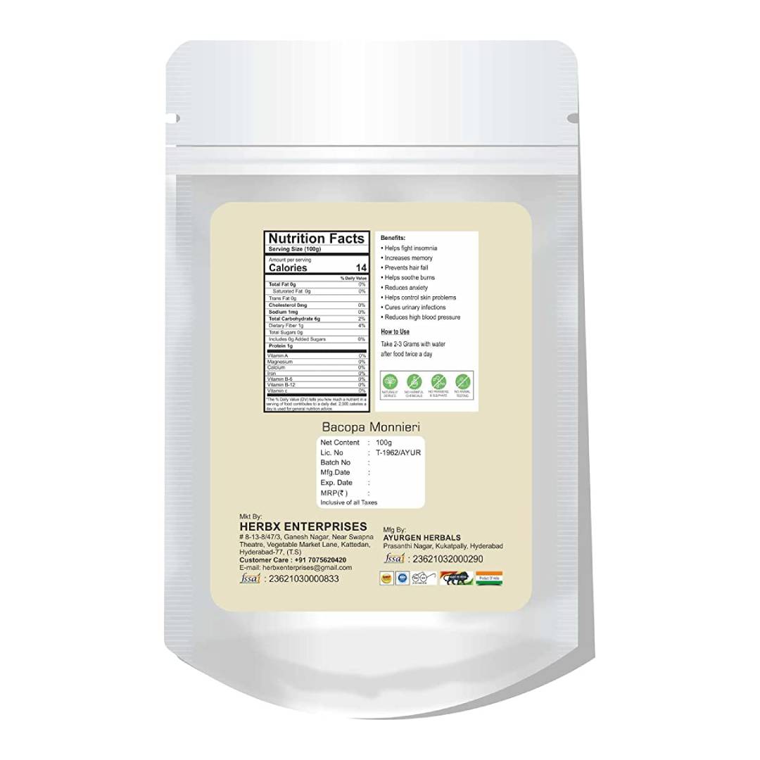 Globyherbs Brahmi (Bacopa Monnieri) Powder helps improve brain function by preventing brain cell damage. It also helps fight insomnia and soothes sunburn. Besides, it controls skin problems and reduces high blood pressure.
